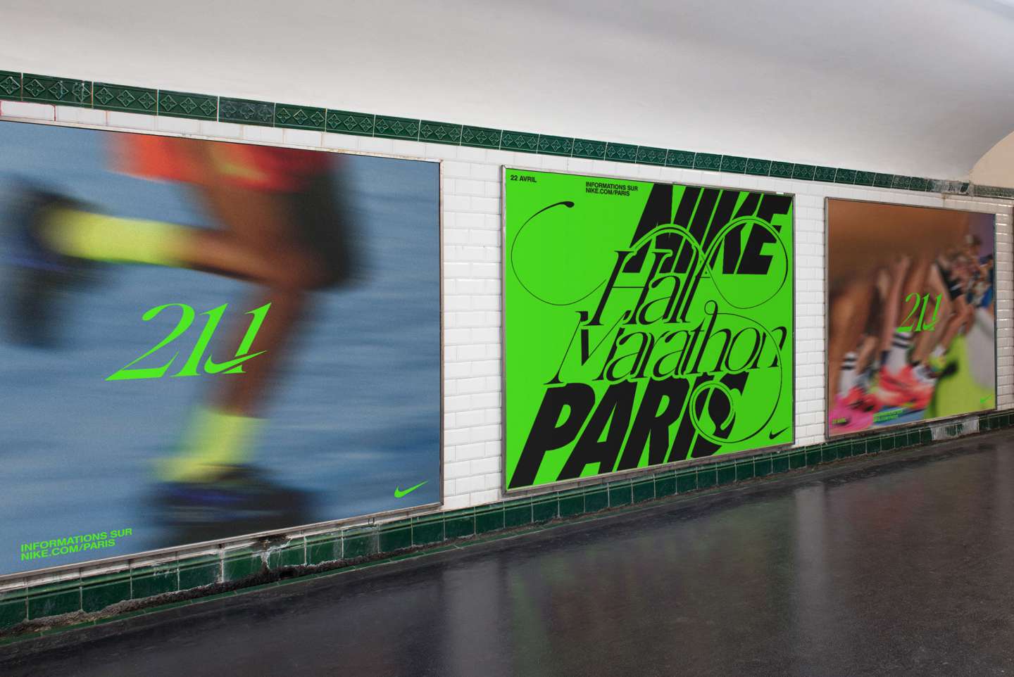 The identity is built around motion—kinetic typography and a sharp, electric green that reflects the intensity of the run. The modified Nike Futura typeface adds a contemporary edge, while an Art Nouveau-inspired serifs brings in a connection to Paris’ visual heritage. Custom illustrations extend the serif details in a way that feels both ornamental and fast, reinforcing the race’s high-energy atmosphere.