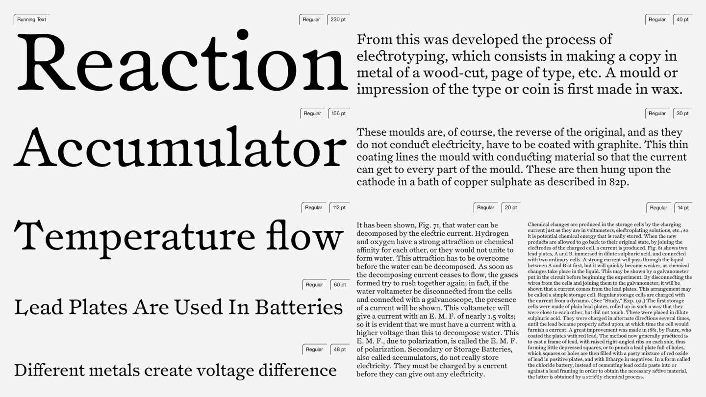 Electricity is a revival typeface inspired by the type used in the 1900 publication "Things a Boy Should Know About Electricity". Based on the original Ronaldson typeface, it retains the warm, characterful serif style of the past, refined to meet the needs of modern design.